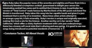 Kama Ruby is originally from Bakersfield, California. She’s been a performer since she was small child. She deftly plies that trade these days as a jazz singer. That’s not her only performing outlet, though. She also performs as an actress and as a dancer. This new two-song single is presented as a part of the publicity push for her new full album.